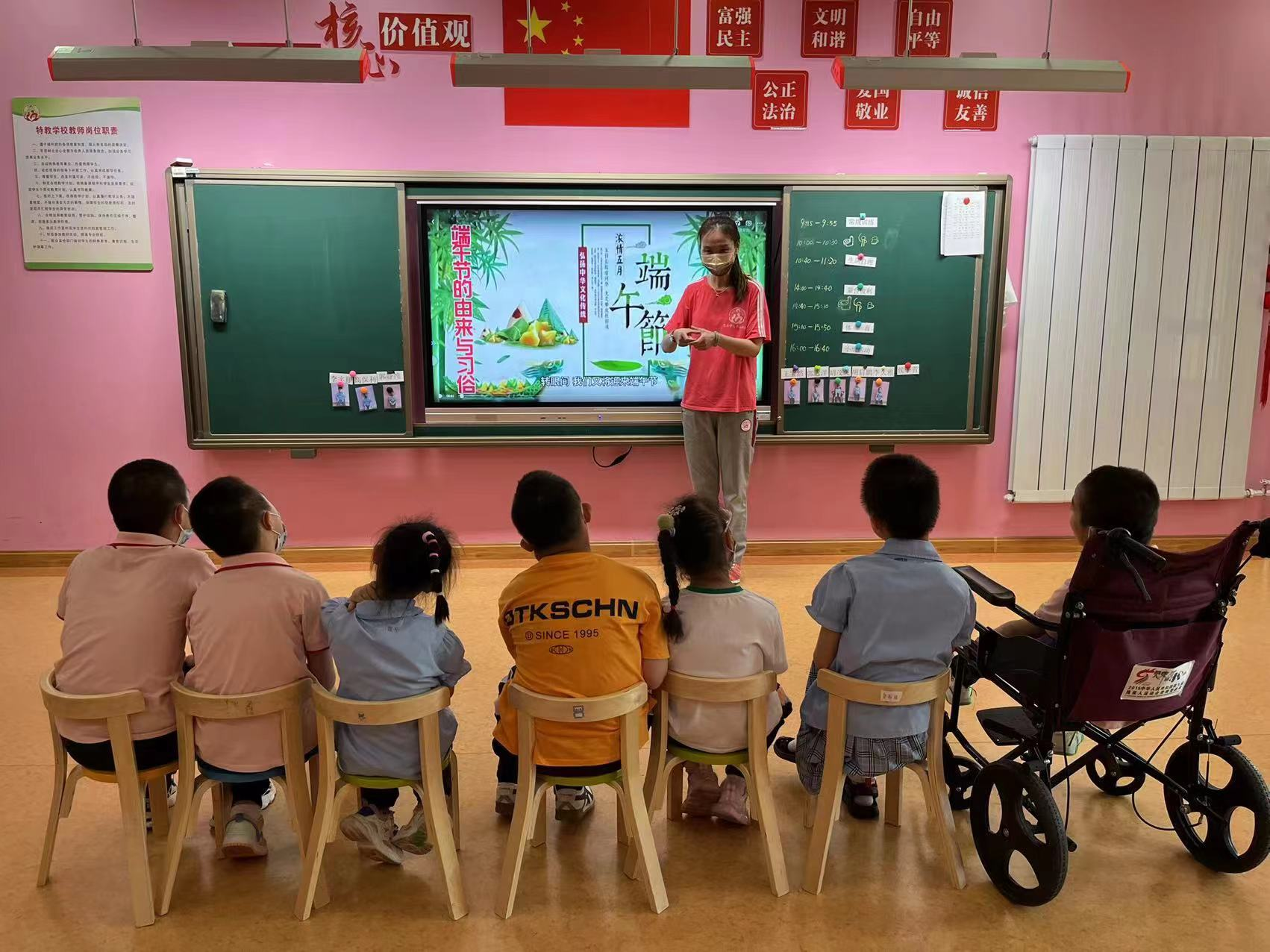 端午节历史悠久,有着丰厚的文化底蕴。为了让孤残儿童们感受中国民俗节日特有的韵味,了解端午节的风俗民情,体验中国特有的历史文化,福利院特教康复部的老师们专门开设了历史文化小讲堂,用生动形象的语言给儿童们讲解了端午节的来历。相传端午节起源于纪念我国伟大的爱国主义诗人屈原,屈原死后楚国百姓哀痛异常,纷纷到汨罗江边去凭吊屈原,为了江中鱼虾不去咬屈原的身体,百姓们用楝树叶包饭外缠彩丝投向江中,由此发展成了今天的粽子。课堂上,老师悉心讲解,孩子们认真听讲,积极提问,整个课堂上充满着温馨、友爱的和谐氛围,让儿童们在感受到浓浓端午情的同时,也铭记传统,传承中华上下五千年的文明,达到了预期效果。